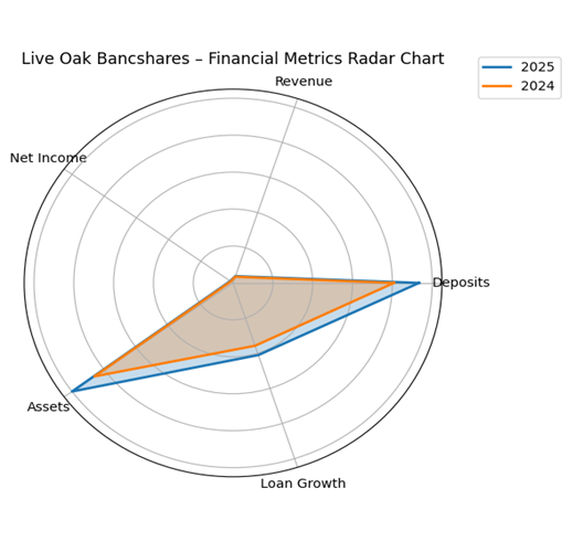 For the full year ended December 31, 2025, Live Oak Bancshares reported total revenue of approximately $577.8 million, compared with $488.6 million in the prior year, reflecting year-on-year growth of about 18%.