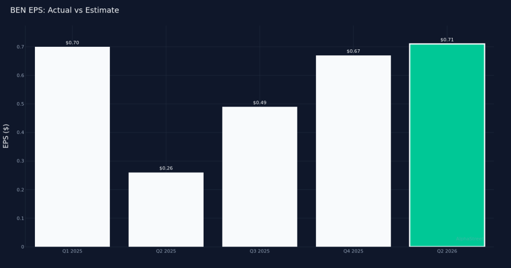 BEN|EPS $0.71 vs $0.56 est (+26.8%)|Rev $2.29B|Net Income $268.2MFranklin Resources, Inc. (BEN) delivered Q2 2026 adjusted earnings of $0.71 per share, surpassing analysts’ $0.56 forecast (beat by 26.8%). The company generated $2.29B in revenue for the quarter. Revenue was up 9.0% year-over-year.