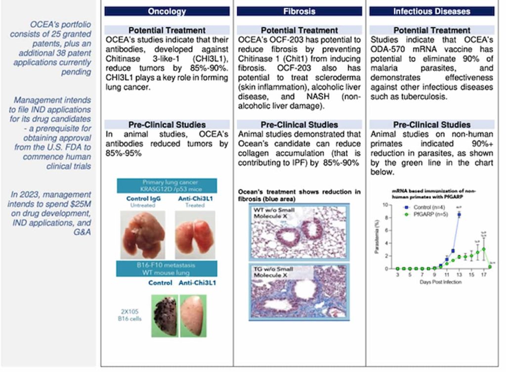 In addition, Ocean Biomedical is planning to progress the manufacturing and IND-enabling studies needed to submit applications to the FDA to initiate human clinical trials and its diversified development pipeline. The pipeline includes three drug candidates for oncology, one for fibrosis, and three for infectious diseases.