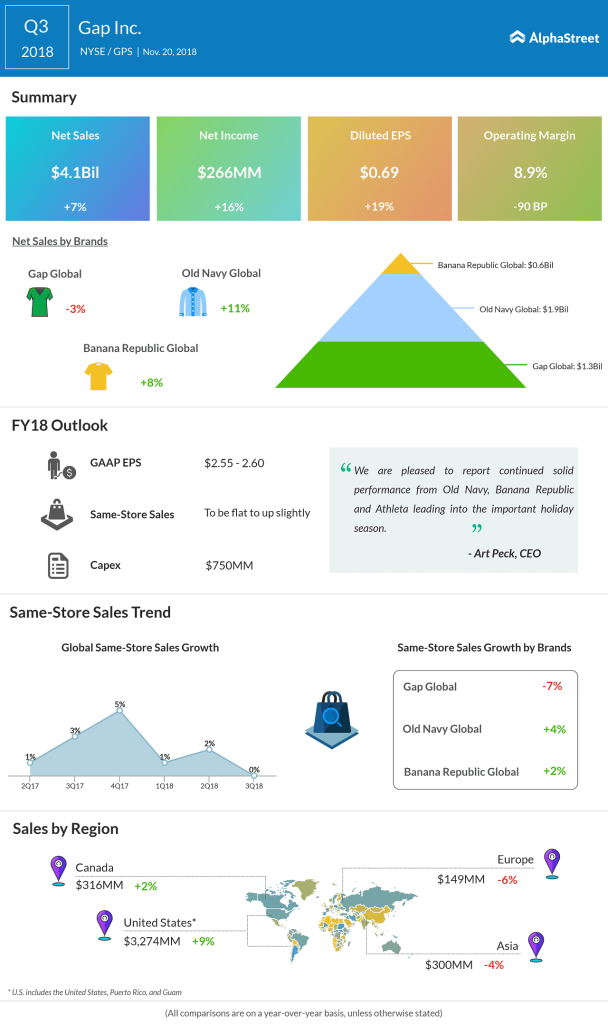“We are pleased to report continued solid performance from Old Navy, Banana Republic and Athleta leading into the important holiday season,” said Art Peck, CEO. He also added that the company is not satisfied with the performance of Gap brand.