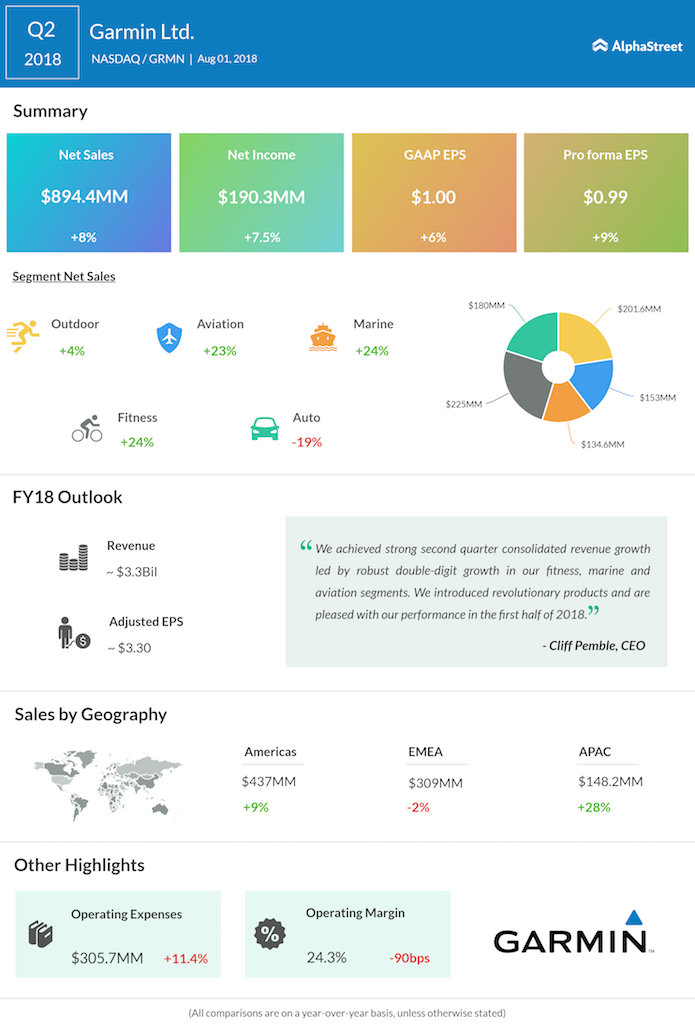 Garmin Ltd. (GRMN) surpassed market expectations on revenue and pro forma EPS numbers for the second quarter of 2018 and raised its outlook for the full year.