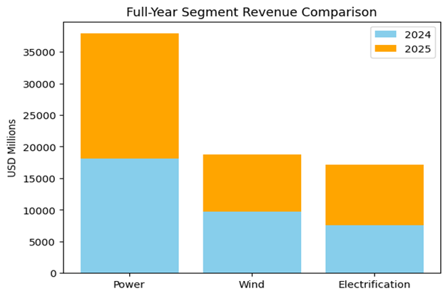 GE Vernova’s fourth-quarter 2025 financial results highlighted a sharp divergence in performance across its core segments, with significant growth in Power and Electrification offsetting a contraction in Wind. The Power segment reported revenue of $5,749 million, representing a 6% increase year-over-year, while achieving a segment EBITDA of 2,368 million compared to the fourth quarter of 2024, resulting in an EBITDA loss of 2,960 million, yielding a segment EBITDA of $505 million and a 17.1% margin as strong demand for grid equipment continued to drive volume and favorable pricing.