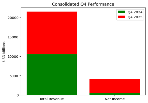 The company concluded 2025 with an $8.8 billion cash balance. Net income increased to $4.9 billion for the year, and the total backlog grew by $31.2 billion year-over-year.