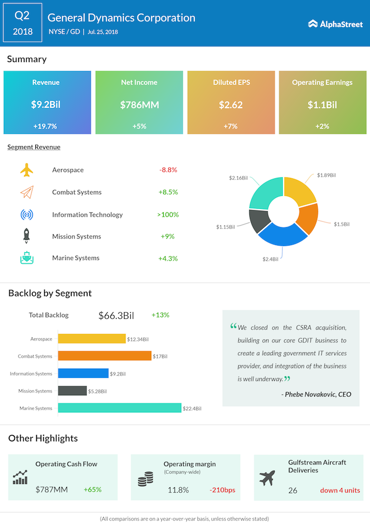 General Dynamics (GD) beats revenue and earnings estimates for the second quarter 2018. Despite earnings and revenue topping the estimates, the stock inched down 0.4% in the pre-market trading. Revenue climbed 19.7% to $9.2 billion from the same period last year, fueled by strong defense volumes and the acquisition of CSRA. The defense businesses saw a revenue increase of 7.1% on an organic basis.