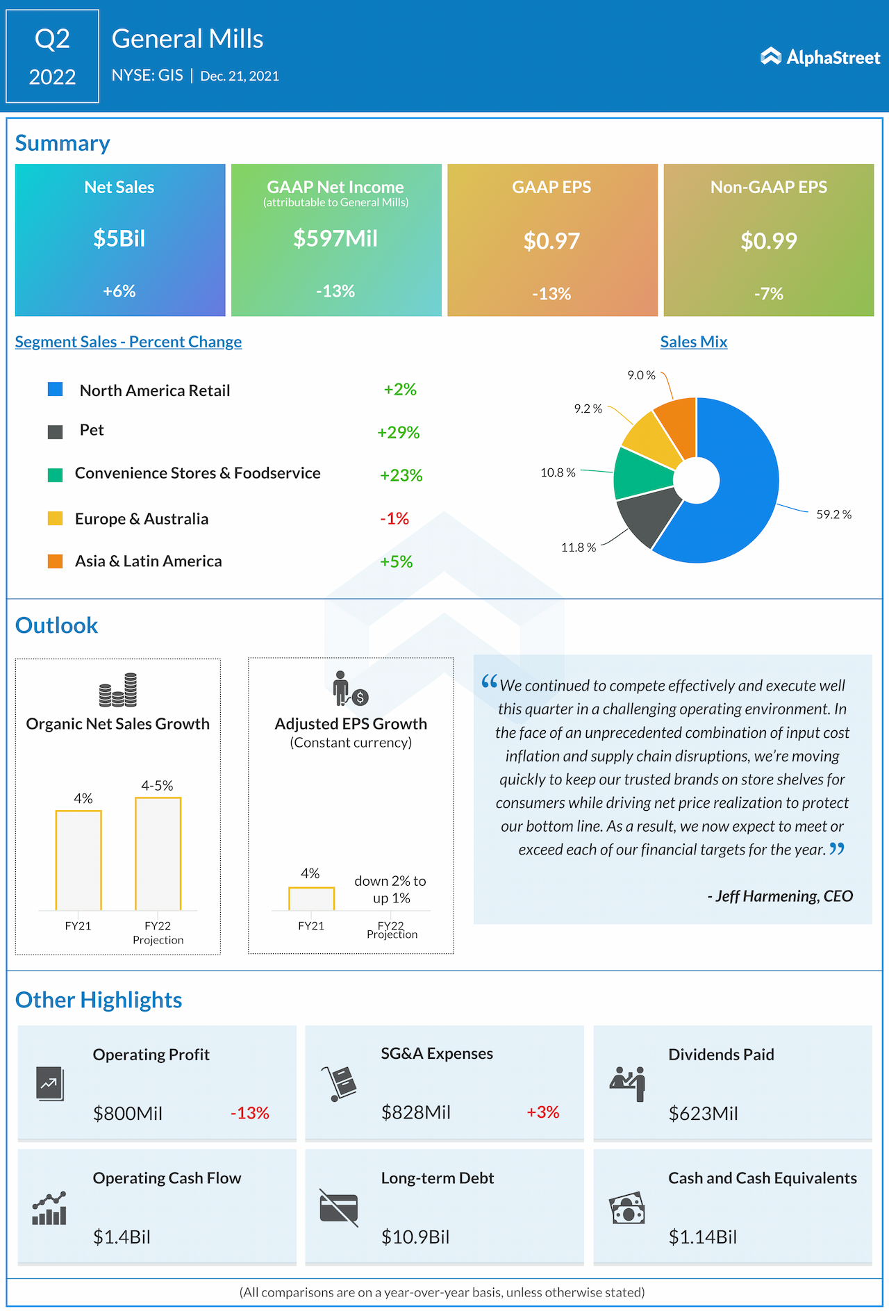 Shares of General Mills Inc. (NYSE: GIS) stayed in green territory after the company delivered mixed results for the second quarter of 2022 a day ago. Net sales increased 6% year-over-year to $5 billion, beating consensus estimates, but adjusted EPS fell 7% in constant currency to $0.99, missing Street targets. However, based on the trends it is seeing in the marketplace and the efforts it has been undertaking, the company remains optimistic on its growth prospects for the long term.