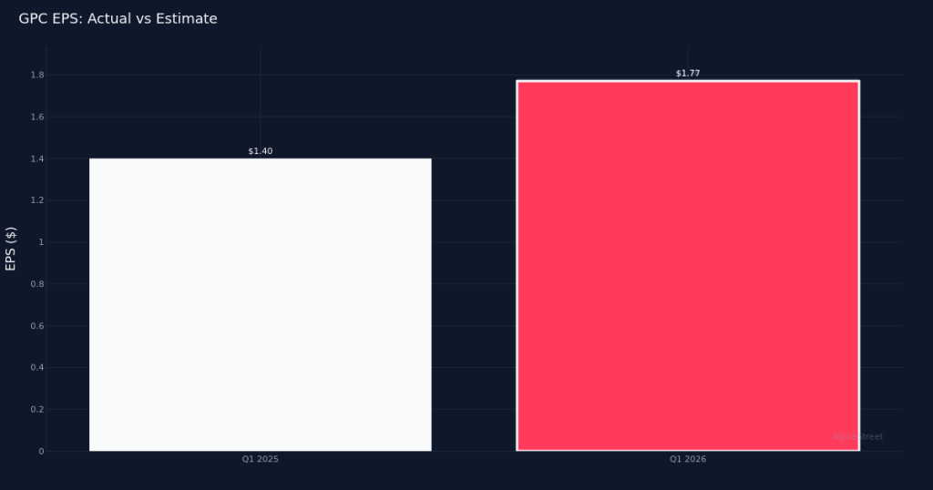 GPC|EPS $1.77 vs $1.78 est (-0.6%)|Rev $6.26B|Net Income $188.5MSlight miss. Genuine Parts Company (NYSE: GPC) reported Q1 2026 adjusted earnings of $1.77 per share, falling short of the $1.78 consensus estimate by 0.6%. Revenue totaled $6.26B for the quarter, up 6.8% from $5.87B in Q1 2025, as the auto parts distributor navigated a challenging demand environment while expanding its global footprint across 10,800 total locations at quarter end. The company earned $244.6M in adjusted net income for the period.