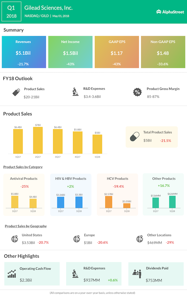 Revenue for the quarter was hurt by a dip in product sales and prescription trends. Lower sales of Harvoni and Sovaldi across all major markets and lower sales of Epclusa in the US due to increased competition hurt product sales.