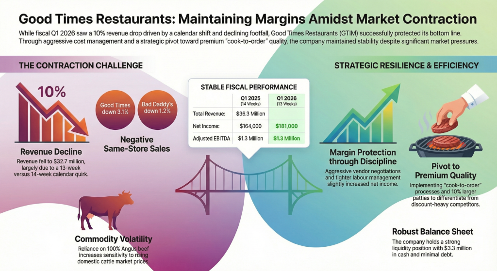 Good Times reported first quarter fiscal 2026 revenue of $32.7 million, representing a 10% decrease from $36.3 million in the prior-year period. Management attributed the decline primarily to a “calendar quirk,” noting that the current quarter included 13 weeks compared to 14 weeks in the first quarter of fiscal 2025.