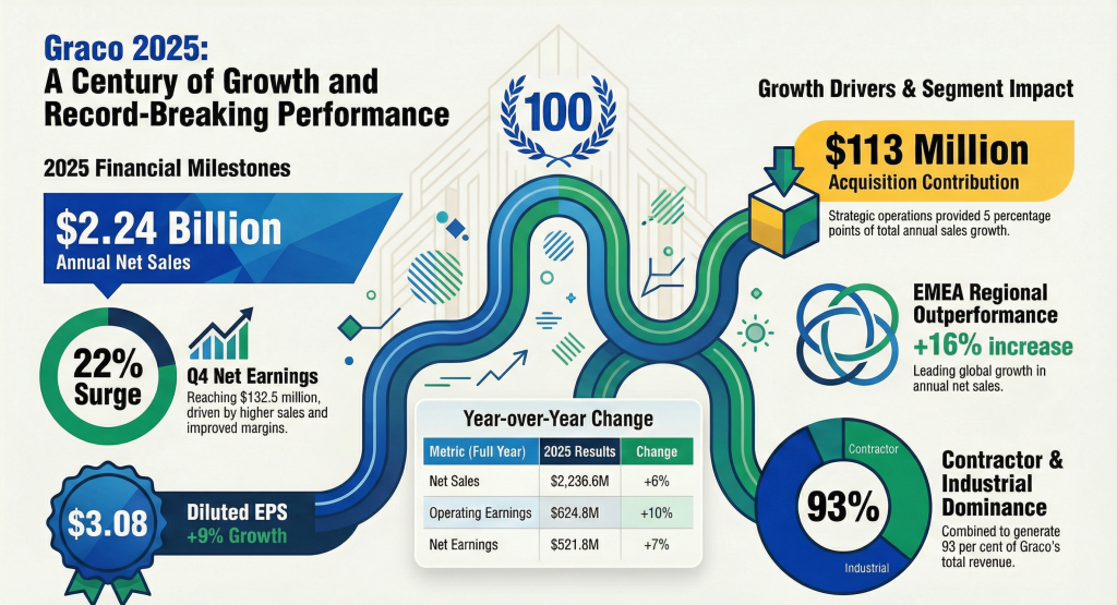 For the full fiscal year 2025, Graco reported net sales of $2.237 billion, up about 6% from $2.113 billion in 2024. Full-year net earnings rose roughly 7% to $521.8 million, and diluted EPS increased about 9% to $3.08. On an adjusted basis, EPS for the year was $2.95, up from $2.77 a year earlier. Operating earnings and adjusted results also showed mid-single-digit growth for the full year, supported by pricing actions and acquisitions.