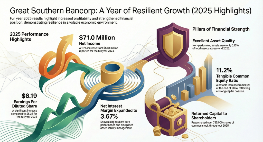 Great Southern Bancorp, Inc. (NASDAQ: GSBC) delivered a strong Q4 2025 with EPS of $1.45, up from $1.27 a year ago. Contrary to “compression” fears, the NIM expanded significantly to 3.70% (vs. 3.49% in Q4 2024). This was achieved through a disciplined reduction in interest expenses, which fell to $24.3 million from $33.1 million year-over-year.