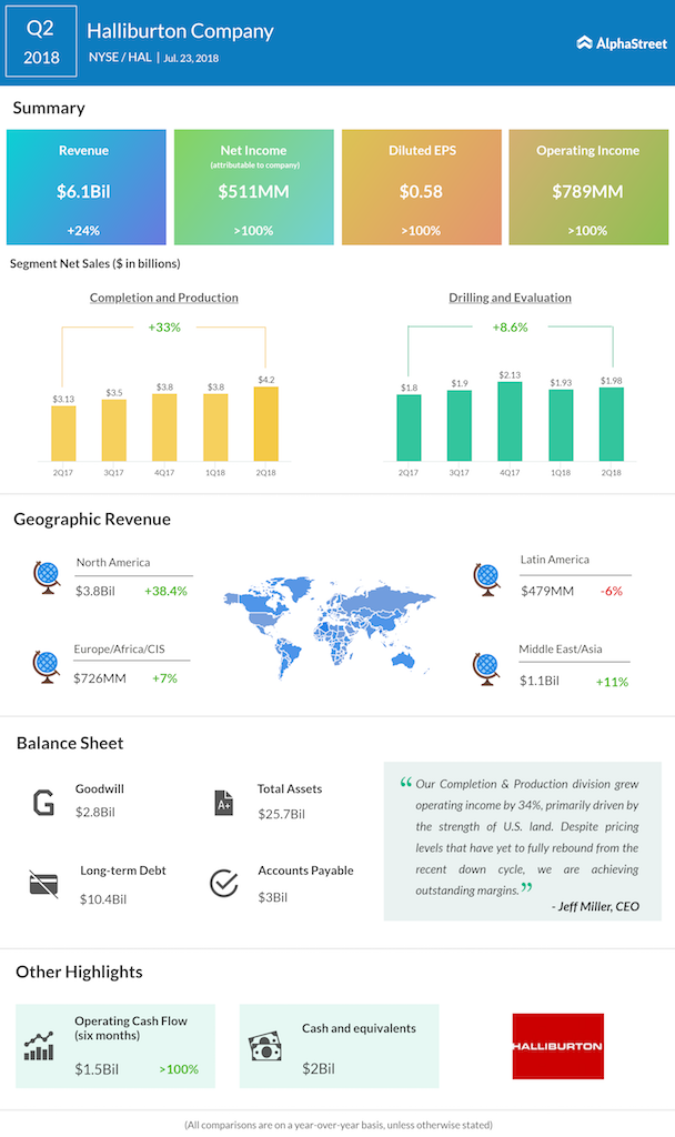Drilling services provider Halliburton Company (HAL) reported earnings for the second quarter that met analysts’ estimates while exceeding on revenue expectations. The company posted a 24% increase in revenue to $6.15 billion driven by strong market conditions in North America.