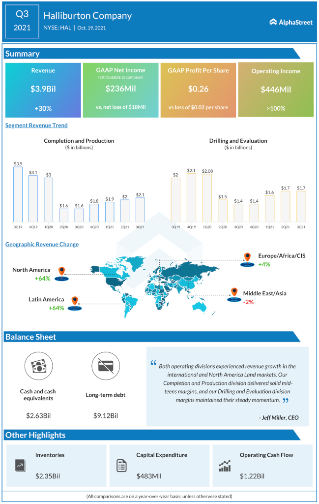Halliburton (NYSE: HAL) reported third-quarter 2021 financial results before the regular market hours on Tuesday. The company reported Q3 revenue of $3.9 billion, up 30% year-over-year and lower than the Wall Street projection. Net income of $0.26 per share also missed the target that analysts had anticipated.