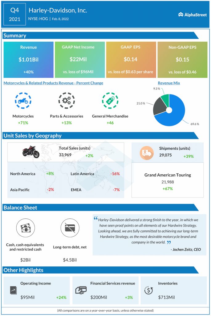 Harley-Davidson, Inc. (NYSE: HOG) the superbike maker reported fourth-quarter results for 2021.