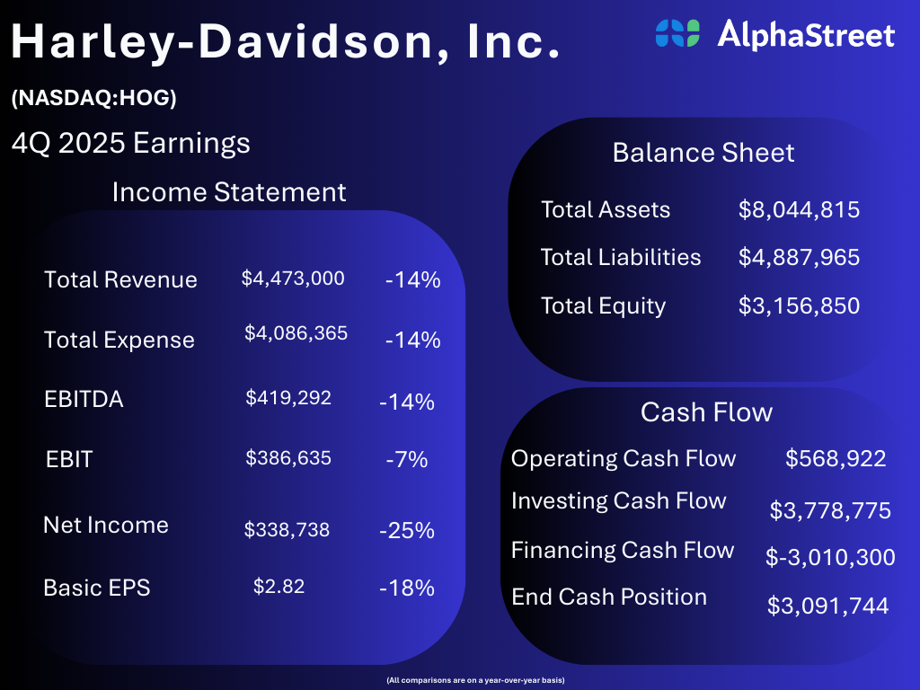 Harley-Davidson, Inc. reported consolidated fourth-quarter 2025 results that point to continued pressure on profitability despite disciplined expense control and a strong year-end cash position. The income statement shows broad-based year-over-year declines across revenue, earnings, and profitability metrics, while the balance sheet and cash flow data indicate solid liquidity and a significantly improved cash position.