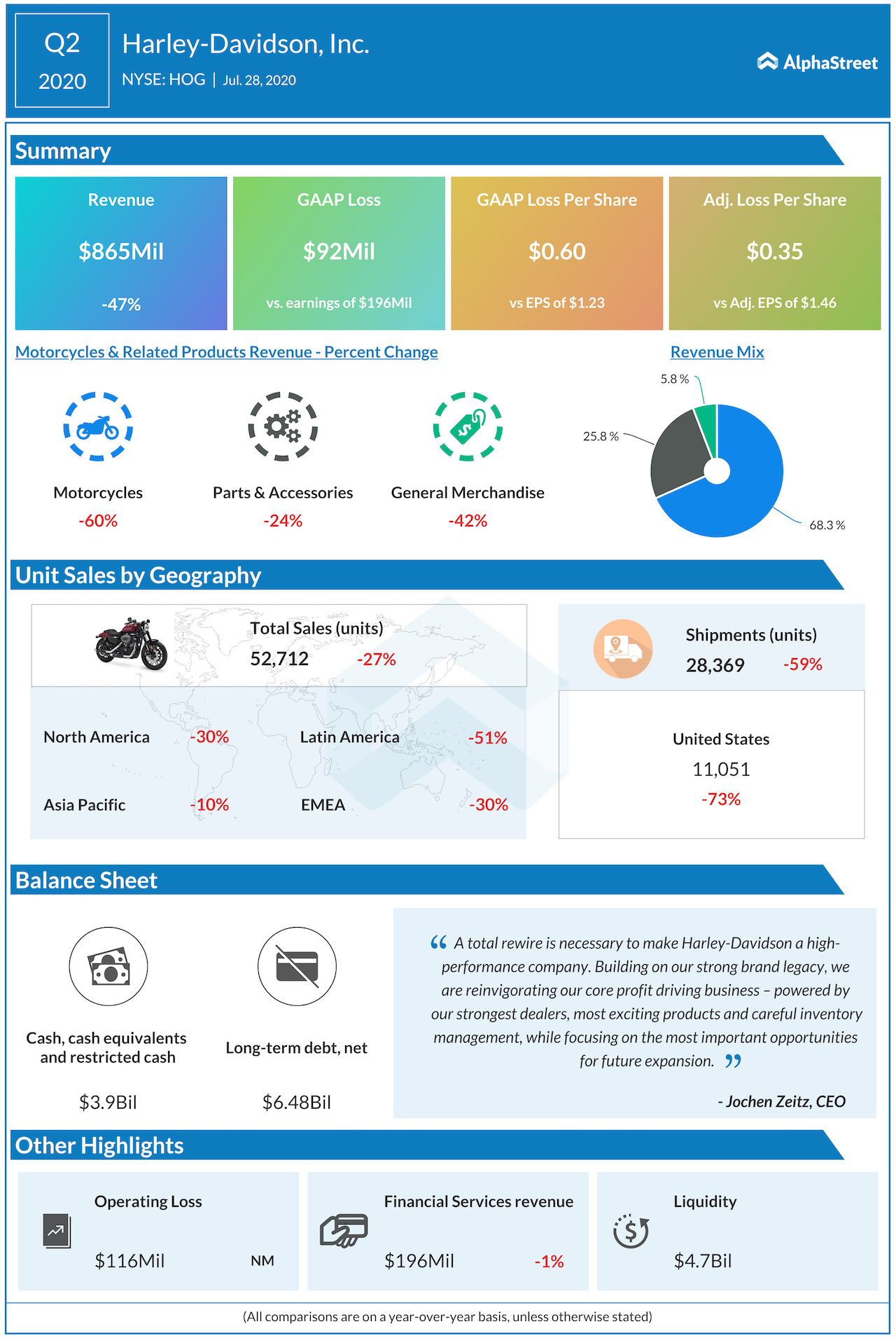 Total revenues in the Motorcycles and Related Products segment fell 33%, with a 36% drop in Motorcycles revenue. Parts & Accessories were down 20%. Global retail motorcycle sales decreased 23% in the first half while sales in the US were down 22% hurt by the pandemic. Latin America saw the highest sales decrease of 37%.