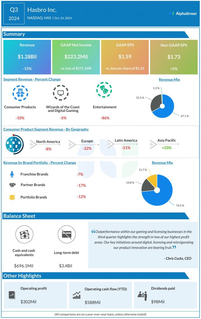 In Q3 2024, Hasbro’s total revenues decreased 15% year-over-year to $1.28 billion, with declines across all its segments. Adjusted earnings increased 5% to $1.73 per share. GAAP EPS was $1.59.
