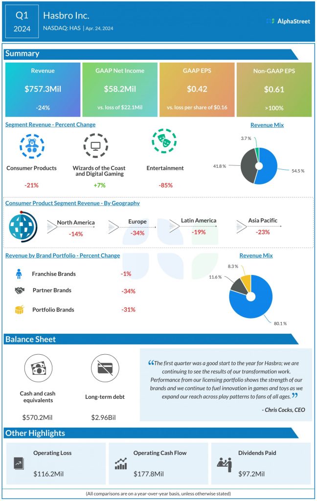 Net earnings attributable to Hasbro, Inc. were $58.2 million, or $0.42 per share, compared to a loss of $22.1 million, or $0.16 per share, last year. Adjusted EPS was $0.61.