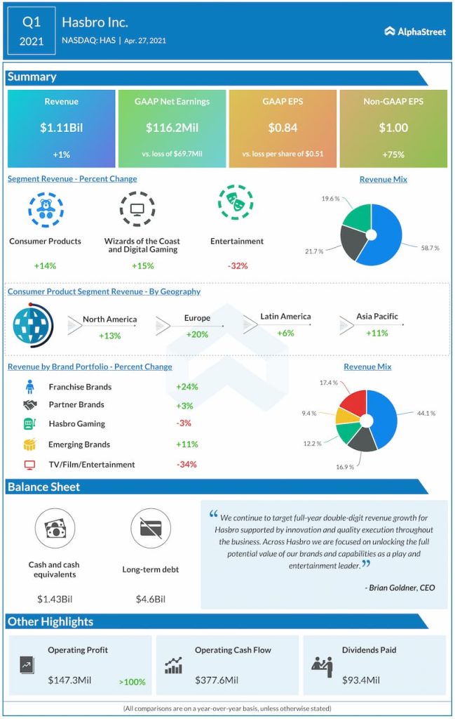 Last week, Hasbro’s rival Mattel Inc. (NASDAQ: MAT) announced its first quarter 2021 earnings results. The company saw sales increase 47% to $874 million. Adjusted loss amounted to $0.10 per share.