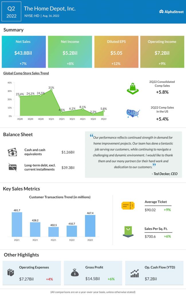 “In the second quarter, we delivered the highest quarterly sales and earnings in our company’s history. Our performance reflects continued strength in demand for home improvement projects. Our team has done a fantastic job serving our customers while continuing to navigate a challenging and dynamic environment.,” said Ted Decker, CEO of Home Depot.