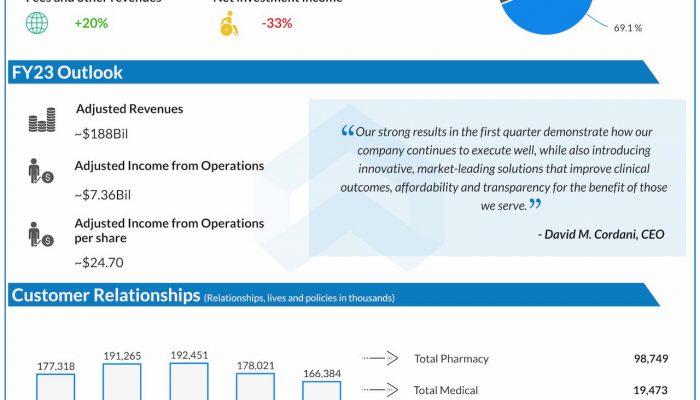 The Cigna Group (NYSE: CI) reported first quarter 2023 earnings results today. Total revenues increased 6% year-over-year to $46.5 billion. Adjusted revenues increased