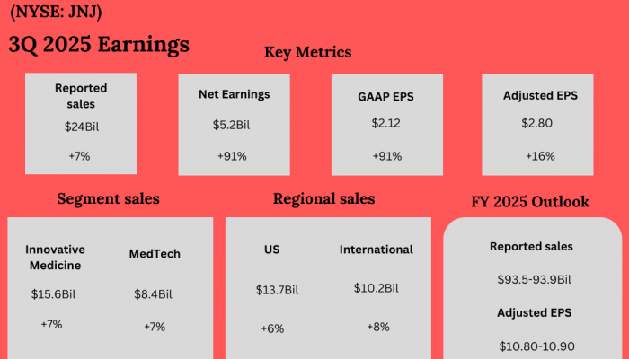 Johnson & Johnson (NYSE: JNJ) reported its third quarter 2025 earnings results today. Reported sales increased 6.8% year-over-year to $24 billion. Operational