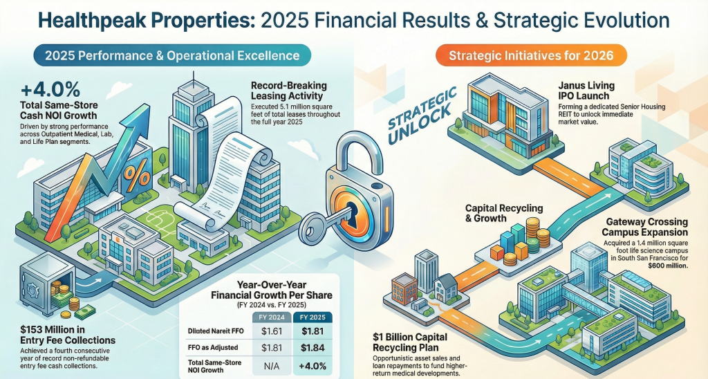 In the fourth quarter, Healthpeak executed 2.1 million square feet of new and renewal leases. Outpatient medical renewals displayed +4.4% cash releasing spreads on 1.5 million square feet, while life plan properties saw strong same-store NOI growth of 16.7% year-over-year and 15.4% sequentially. Lab lease spreads were slightly negative at -1.7%. Strategic capital recycling continued with about $325 million of outpatient medical dispositions and $24 million in loan repayments during Q4, while the company moved to recapitalize and sell an 80% interest in a six-property outpatient portfolio for roughly $170 million in expected proceeds. Healthpeak also completed acquisitions, including a 1.4 million square foot life sciences campus in South San Francisco for $600 million, and increased its senior housing footprint with joint venture buyouts.