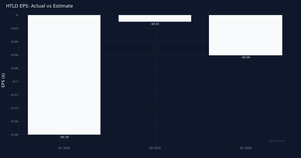 HTLD|EPS -$0.06|Rev $176.3M|Net Loss $4.8MHeartland Express, Inc. (HTLD) reported Q1 2026 Basic and Diluted earnings of -$0.06 per share. The company generated $176.3M in revenue for the quarter. Revenue of $176.3M was down 19.7% year-over-year.