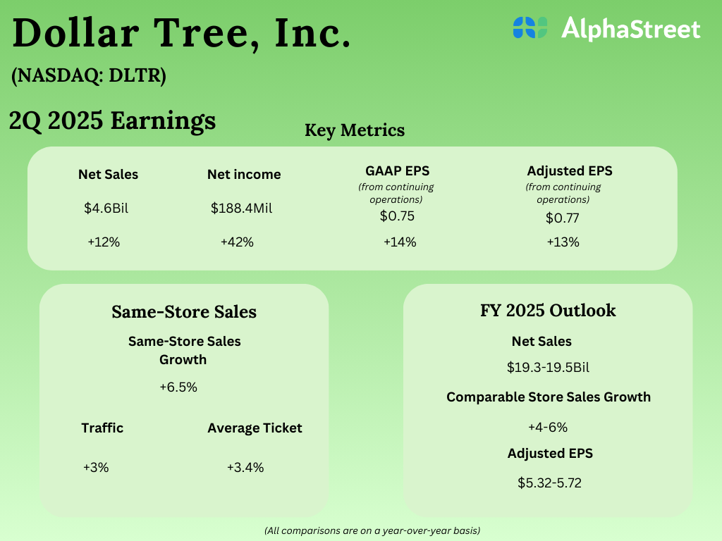 Dollar Tree raised its outlook for fiscal year 2025 and now expects net sales to be $19.3-19.5 billion, based on comparable store sales growth of 4-6%. Adjusted EPS from continuing operations is expected to be $5.32-5.72.