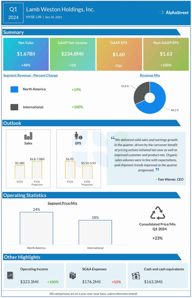 For fiscal year 2024, Lamb Weston expects net sales of $6.8-7.0 billion, which represents organic growth of 6.5-8.5%. The guidance includes $1.1-1.2 billion of incremental sales from acquisitions. GAAP EPS is expected to be $5.47-5.92 while adjusted EPS is expected to be $5.50-5.95.