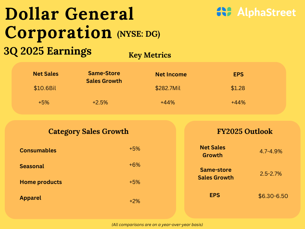 In Q3 2025, Dollar General’s net sales increased 4.6% year-over-year to $10.6 billion, driven by same-store sales growth and positive contributions from new stores. Same-store sales grew 2.5%. Net income rose 43.8% to $282.7 million, or $1.28 per share, compared to last year.