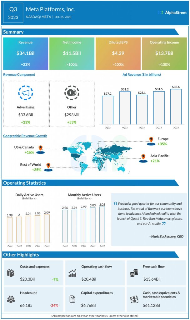 Meta’s balance sheet remains strong. The company had $61.12 billion of cash, cash equivalents and marketable securities as of September 30, 2023. Cash flow from operations was $20.4 billion and free cash flow was $13.64 billion in the third quarter of 2023.