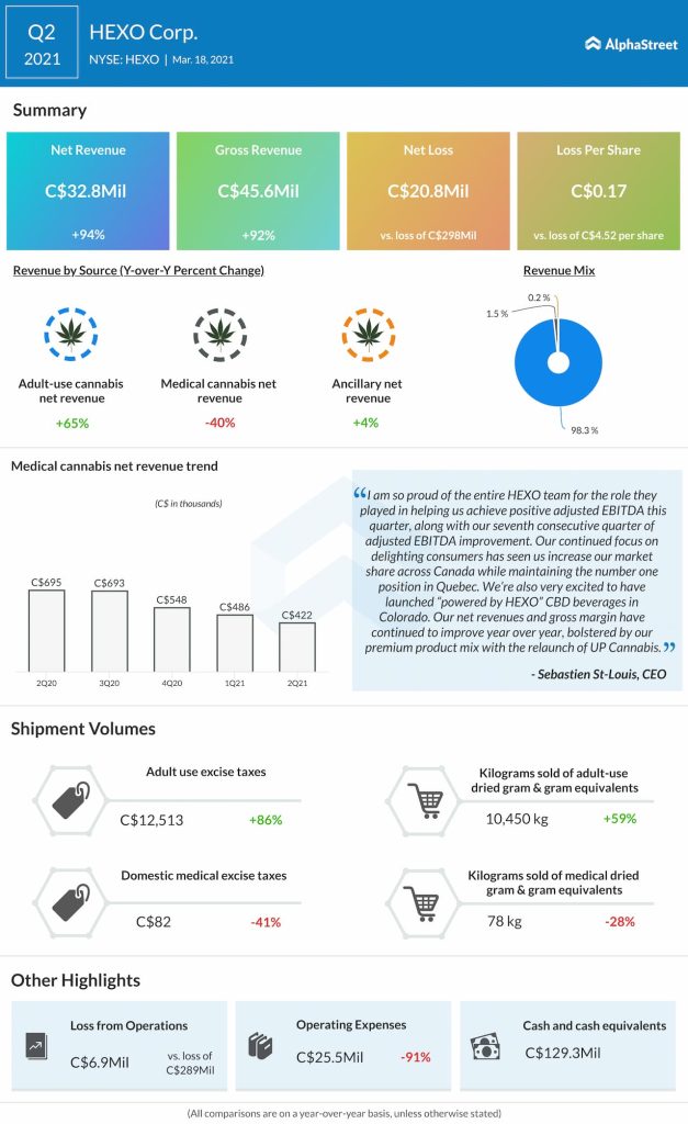 “HEXO Corp. (NYSE: HEXO) reported its second-quarter 2021 earnings results today. Net revenue rose 94% year-over-year to CAD32.8 million. Net loss narrowed to CAD20.8 million from a loss of CAD298.1 million in the same period last year. The net loss per share was CAD0.17 compared to CAD4.52 in the same quarter of the previous year.