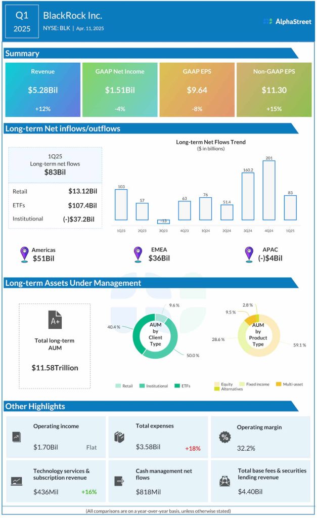 “BlackRock’s positioning and connectivity with clients are stronger than ever, and it’s clear in our results. We delivered 6% organic base fee growth in the first quarter, representing our best start to a year since 2021 and secular strength against a complex market backdrop,” said CEO Laurence Fink.