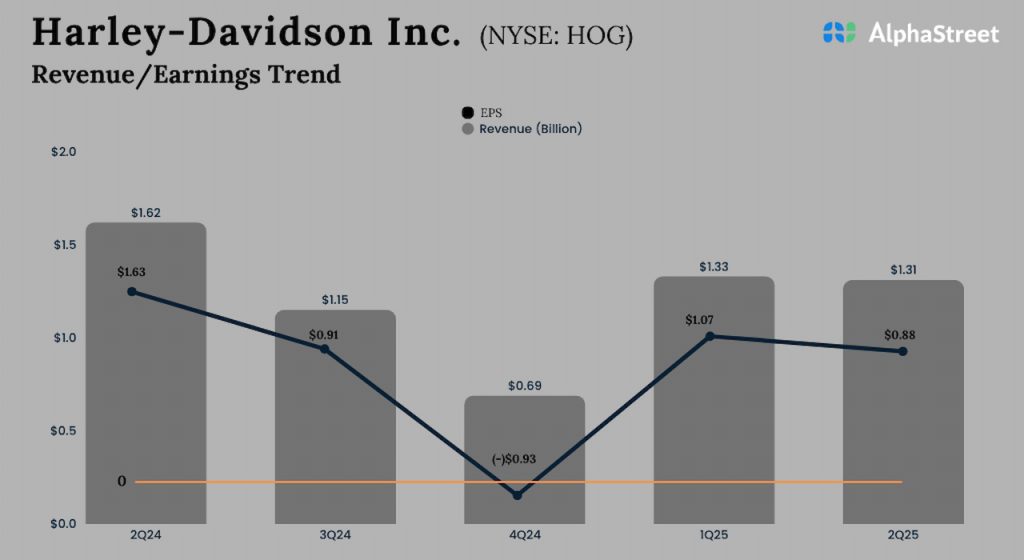 The weak earnings performance reflects a 19% fall in revenues to $1.31 billion in Q2. Motorcycle sales dropped 15% during the three months.