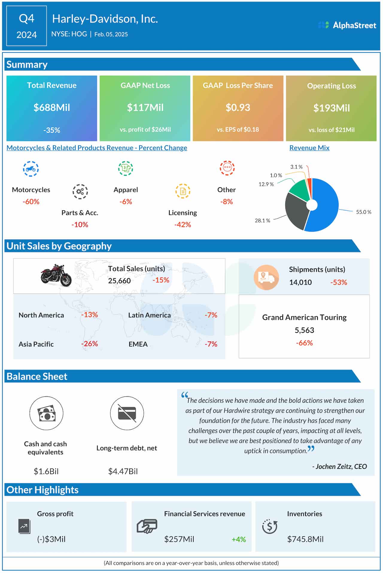 Motorcycle manufacturer Harley-Davidson Inc. (NYSE: HOG) reported a net loss for the fourth quarter of 2024 as its sales declined amid weak demand.