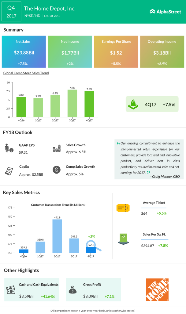 When compared to its rival Lowe, Home Depot has been enjoying more the recovery of the housing market. Homebuilding has grown to more than a one-year high in January. According to the Commerce Departments, housing starts rose 9.7%, highest level noted since October 2016. The retailer also benefited by the impact of hurricanes that hit the Southern US as well as from the reconstruction efforts from the other natural disasters that took place around the same time.