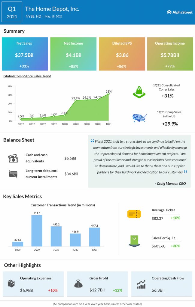 “The Home Depot, Inc. (NYSE: HD) reported first-quarter 2021 earnings results today. Net sales increased 32.7% year-over-year to $37.5 billion. Comparable sales were a positive 31%. Net income was $4.1 billion, or $3.86 per share, compared to $2.2 billion, or $2.08 per share, in the same period last year.