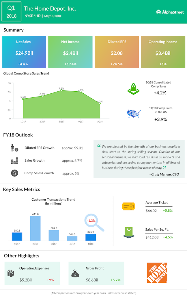 Home Depot Inc. (HD) reported a 4.4% increase in sales to $24.9 billion for the first quarter of 2018 compared to the prior-year period. Comparable sales were positive 4.2%, and US comparable sales were positive 3.9%. The company posted strong results in all markets and categories outside the seasonal business.
