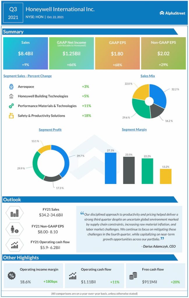 Net income attributable to Honeywell was $1.25 billion, or $1.80 per share, compared to $758 million, or $1.07 per share, in the year-ago quarter. Adjusted EPS rose 29% to $2.02, beating estimates of $1.99.