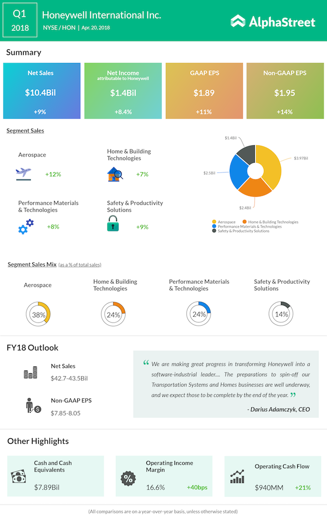 Industrial conglomerate Honeywell International Inc. (HON) reported better-than-expected first-quarter results, backed by exceptional sales performance across its segments. The company lifted its outlook for fiscal 2018 after the strong first-quarter performance, healthy demand environment, and continued execution confidence.