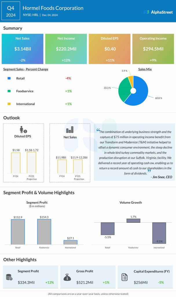 Net sales decreased modestly to $3.14 billion in the October quarter from $3.20 billion in the comparable period in fiscal 2023. The latest number matched analysts’ estimates. For fiscal 2025, the management expects net sales to be in the range of $11.9 billion to $12.2 billion and sees full-year organic sales growth of 1- 3%.