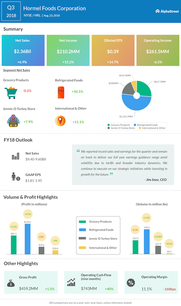 Hormel Foods Corporation (HRL) missed analyst expectations on revenues for the third quarter of 2018 but posted EPS in line with estimates. The company reaffirmed its full-year EPS guidance but lowered the outlook for sales, sending shares down over 6% premarket.