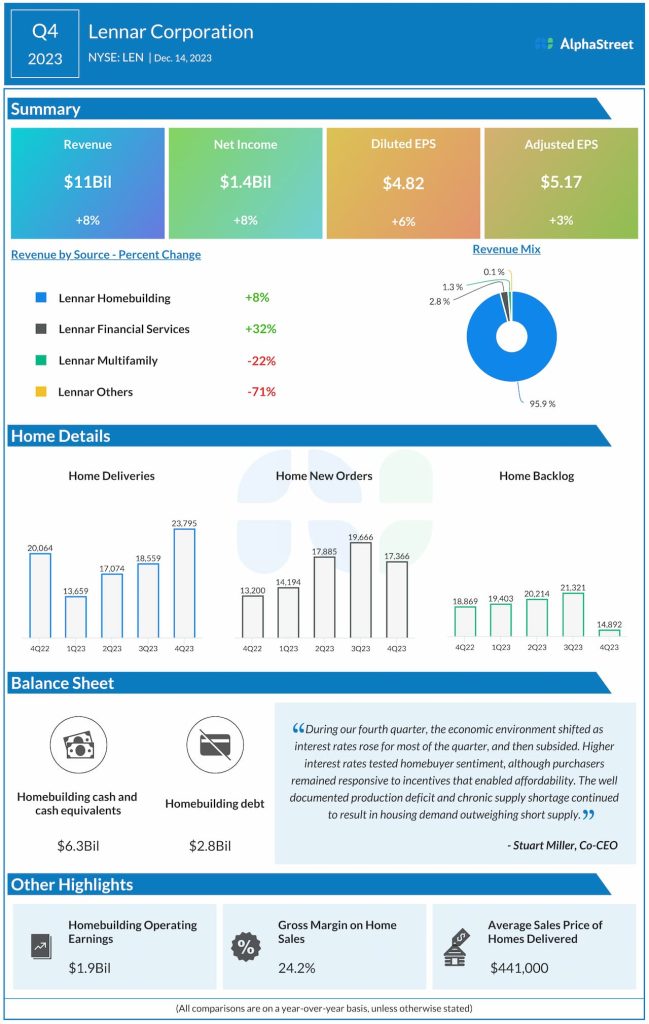 Lennar anticipates a lowering in interest rates in 2024. Lower interest rates will allow the company to reduce incentives thereby helping it recover margins. At present, the homebuilder expects margins to be at least consistent with 2023 levels. Gross margin on home sales were 23.3% in FY2023. Lennar also expects to see a 10% growth in deliveries in 2024, which would amount to approx. 80,000 deliveries in the year.