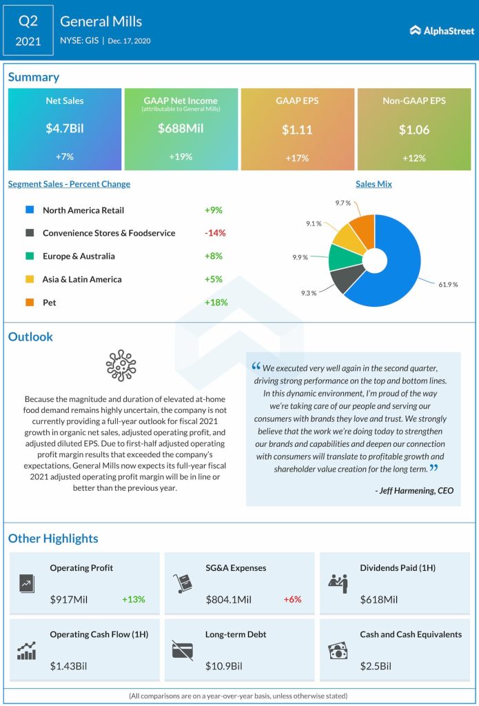 Net earnings attributable to General Mills increased 19% to $688 million while EPS rose 17% to $1.11, mainly due to higher operating profit, lower net interest expense, and higher after-tax earnings from joint ventures. Adjusted EPS amounted to $1.06.