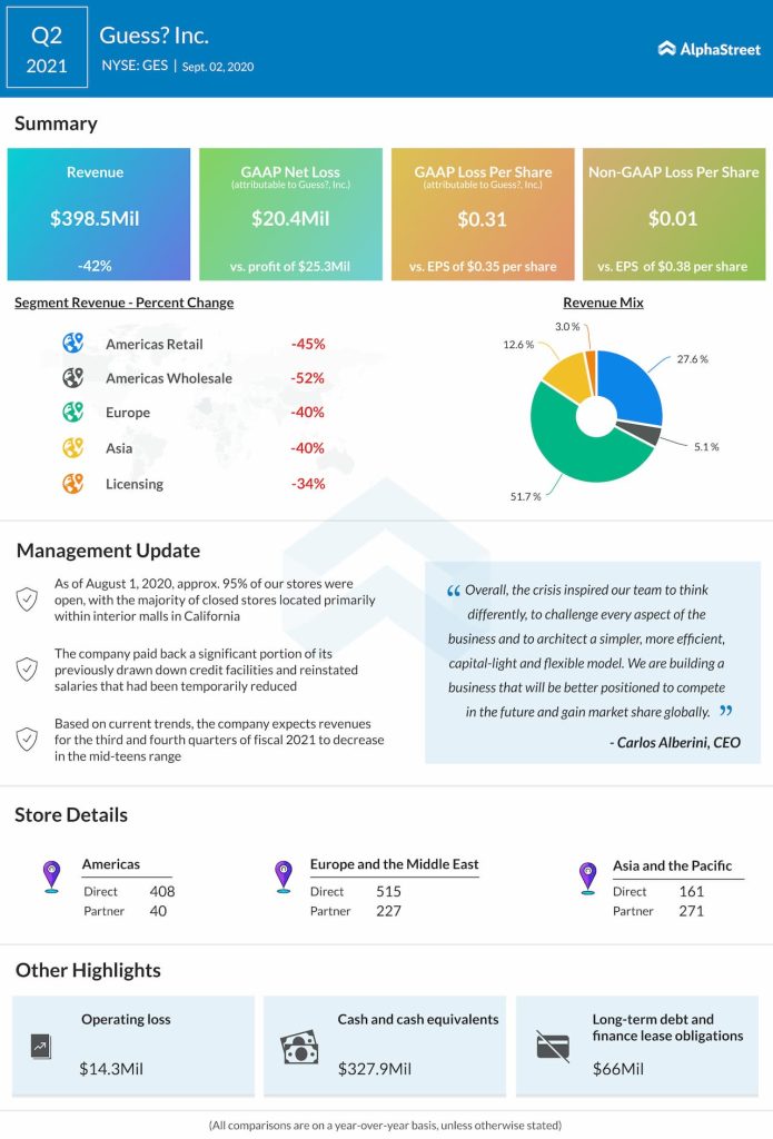 Guess is not providing specific guidance due to the uncertainty associated with the COVID-19 pandemic. Based on current trends, the company expect revenues for the third and fourth quarters of fiscal 2021 to decrease in the mid-teens range.