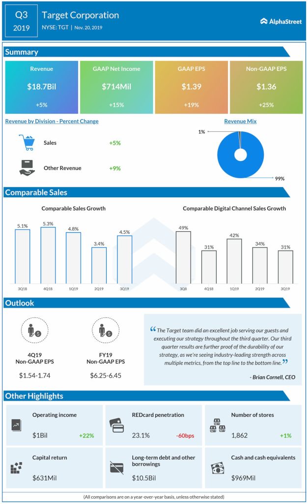 During the early part of the holiday season, comprising the months of November and December, Target’s comparable sales increase by 1.4%. The outcome did not go well with the market, which was expecting a better performance. The slowdown is attributable to weakness in the main holiday categories, which more than offset the higher sales in the other areas.