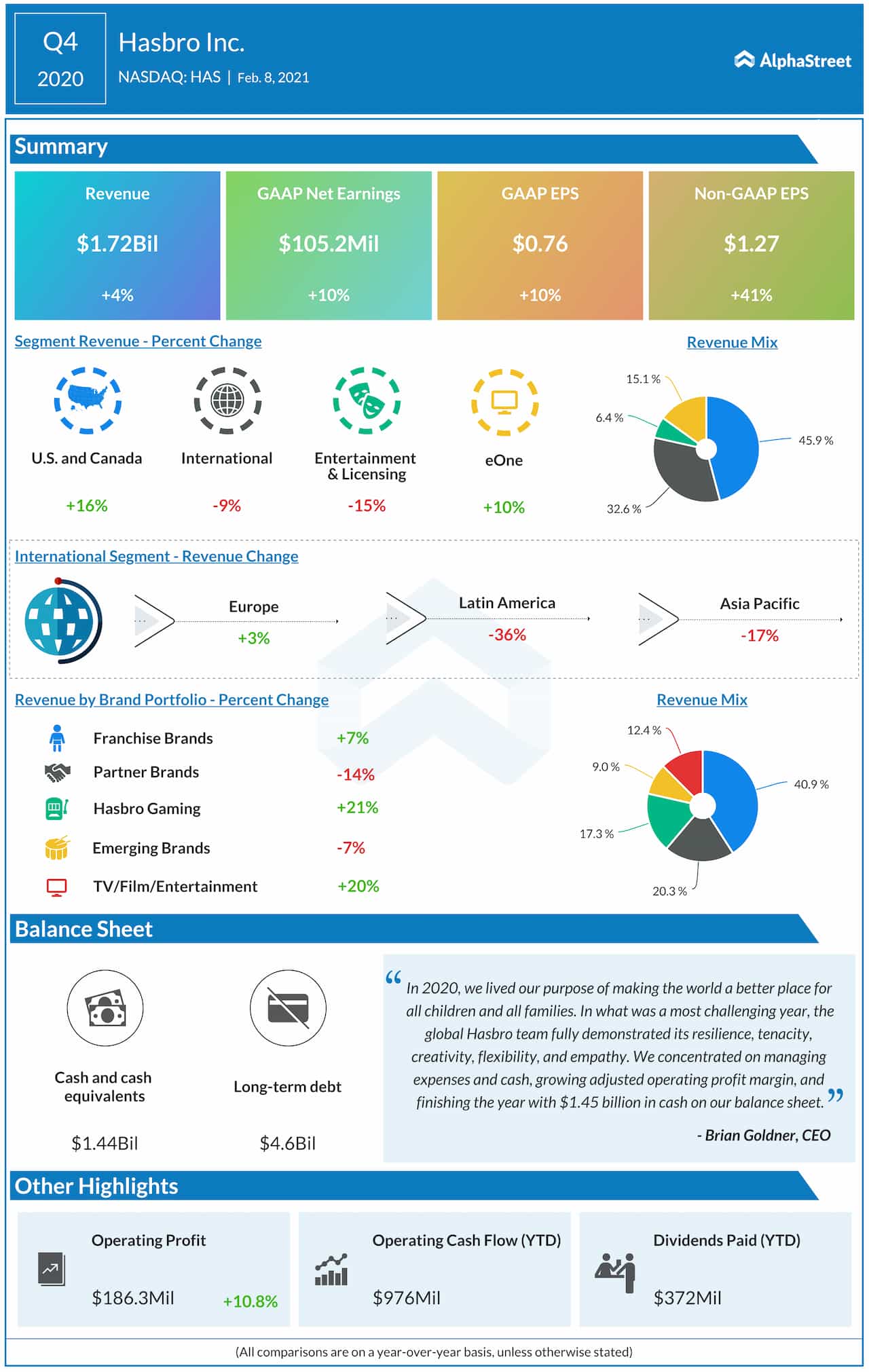 Looking ahead to this year, Hasbro expects its traditional toys and games business to grow in line with or ahead of the industry. Its Wizards of the Coast and Digital Gaming segment is expected to grow faster than the rest of the business.