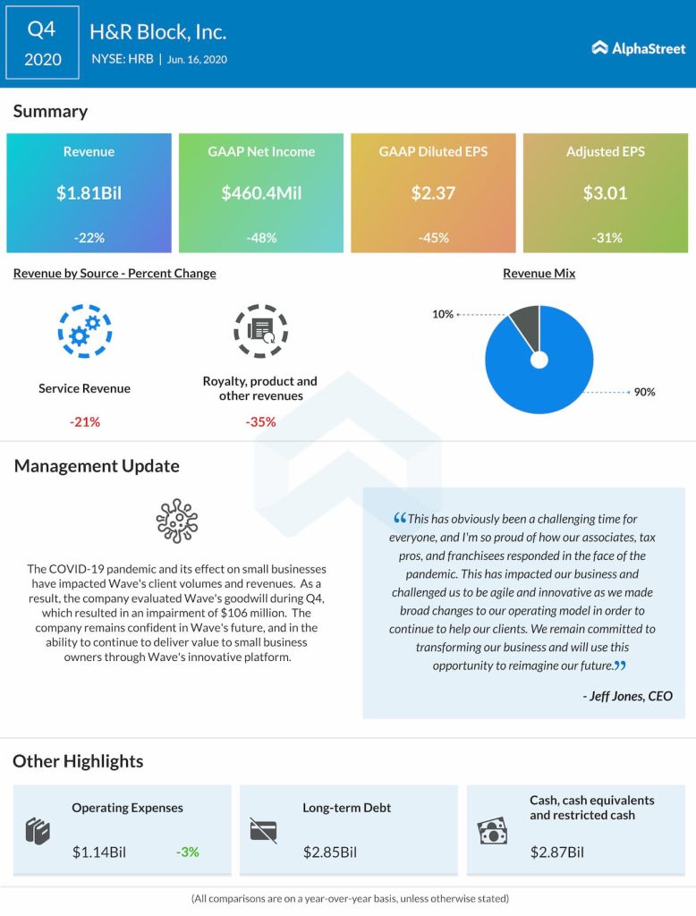 For the fourth quarter, earnings dropped by 48% due to lower revenues. No share repurchases were made in the fourth quarter of fiscal 2020. The company will provide an update on its complete tax season 2020 results during its fiscal 2021 first-quarter earnings call.