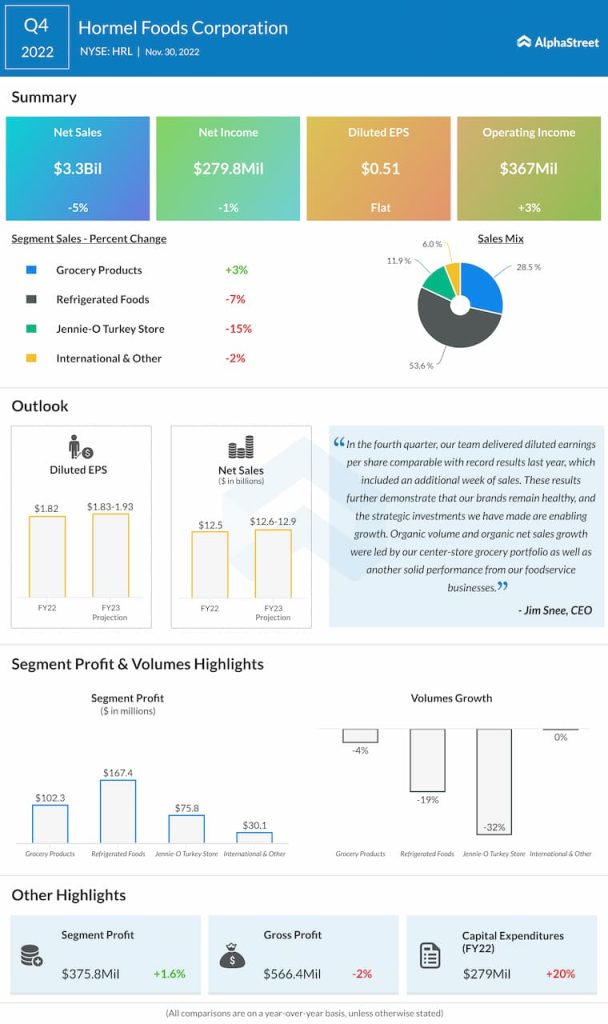 Net earnings attributable to Hormel Foods Corporation were $279.8 million, or $0.51 per share, compared to $281.7 million, or $0.51 per share, last year.