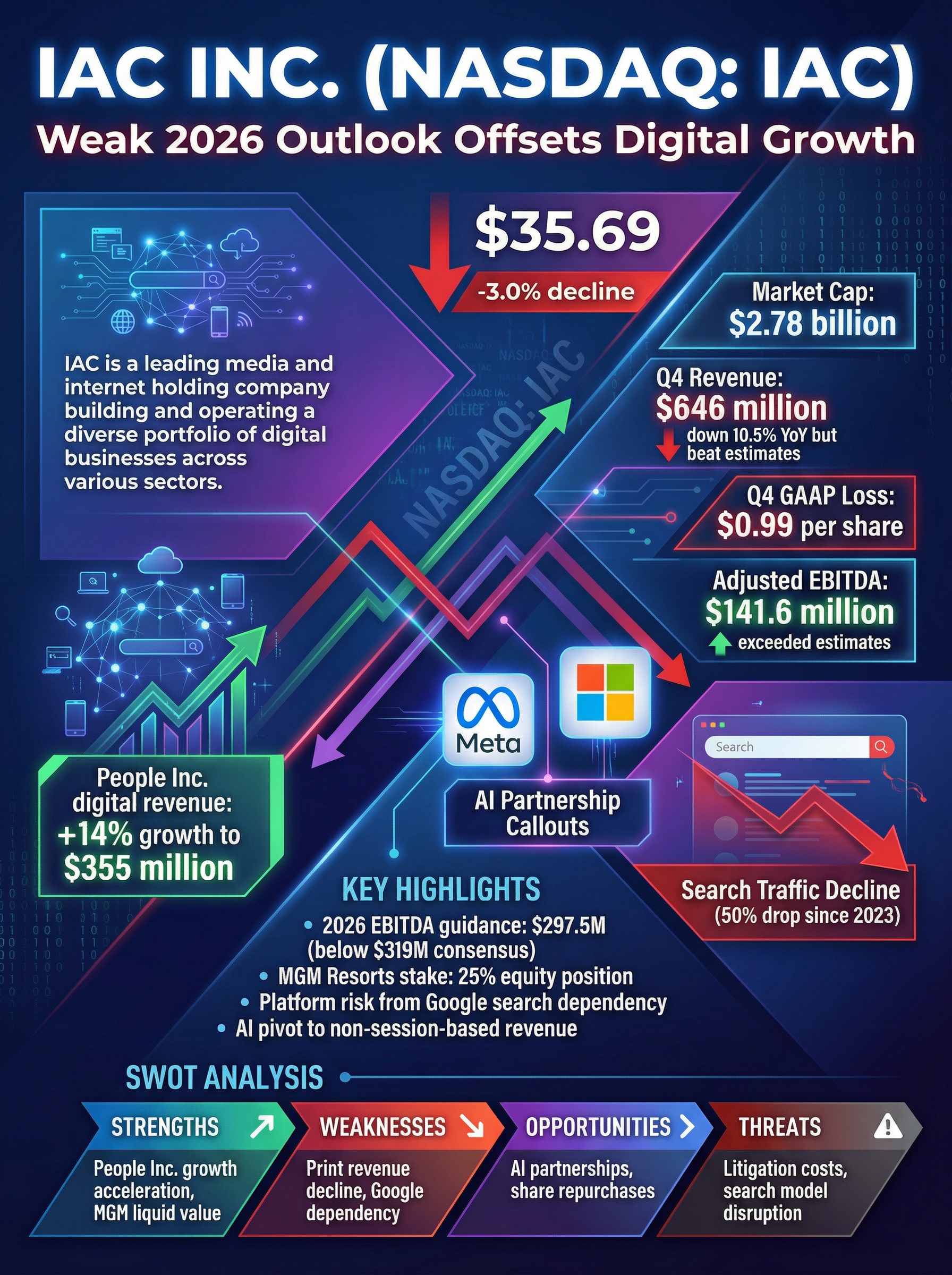 - Asset Concentration: With the spin-off of Angi completed, IAC’s valuation is increasingly tied to its 25% stake in MGM Resorts (65.8 million shares), exposing shareholders to hospitality and gaming sector volatility.